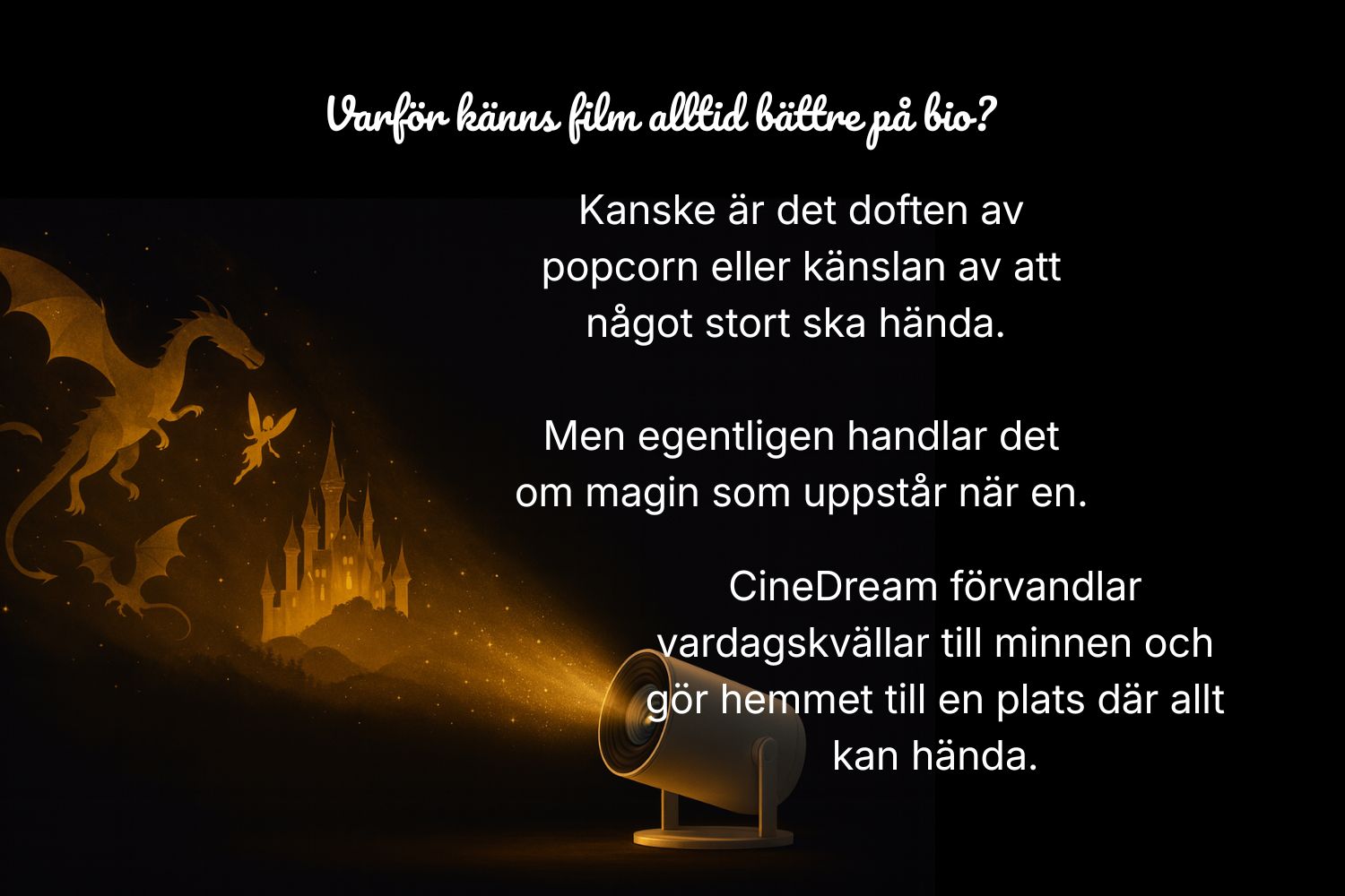 Att planera en filmkväll eller bara mysa tillsammans blir något helt annat när rummet fylls av magi. Med CineDream kan du skapa storslagna vyer, sagolika världar och biokänsla — precis där du är, om och om igen.